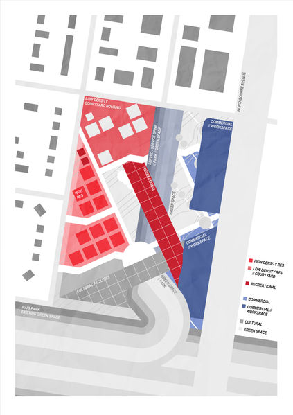 A matrix of squares sweeping over the painterly phase of the project encouraged me to interperate the ground plane of the site as a fine grain mixed use precinct. I took the squares as subtractive to an overall form set to distinct levels of public and private usage.