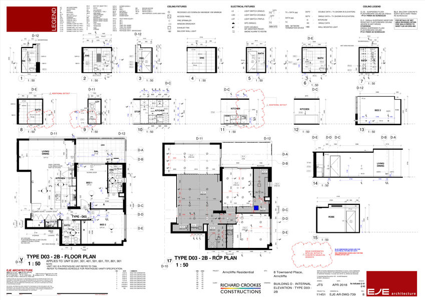 Supplied here is a partial set of documentation for building D of the project, where the vast majority of the of the fitouts, dimensions and annotations, of the internal elevations is my work.